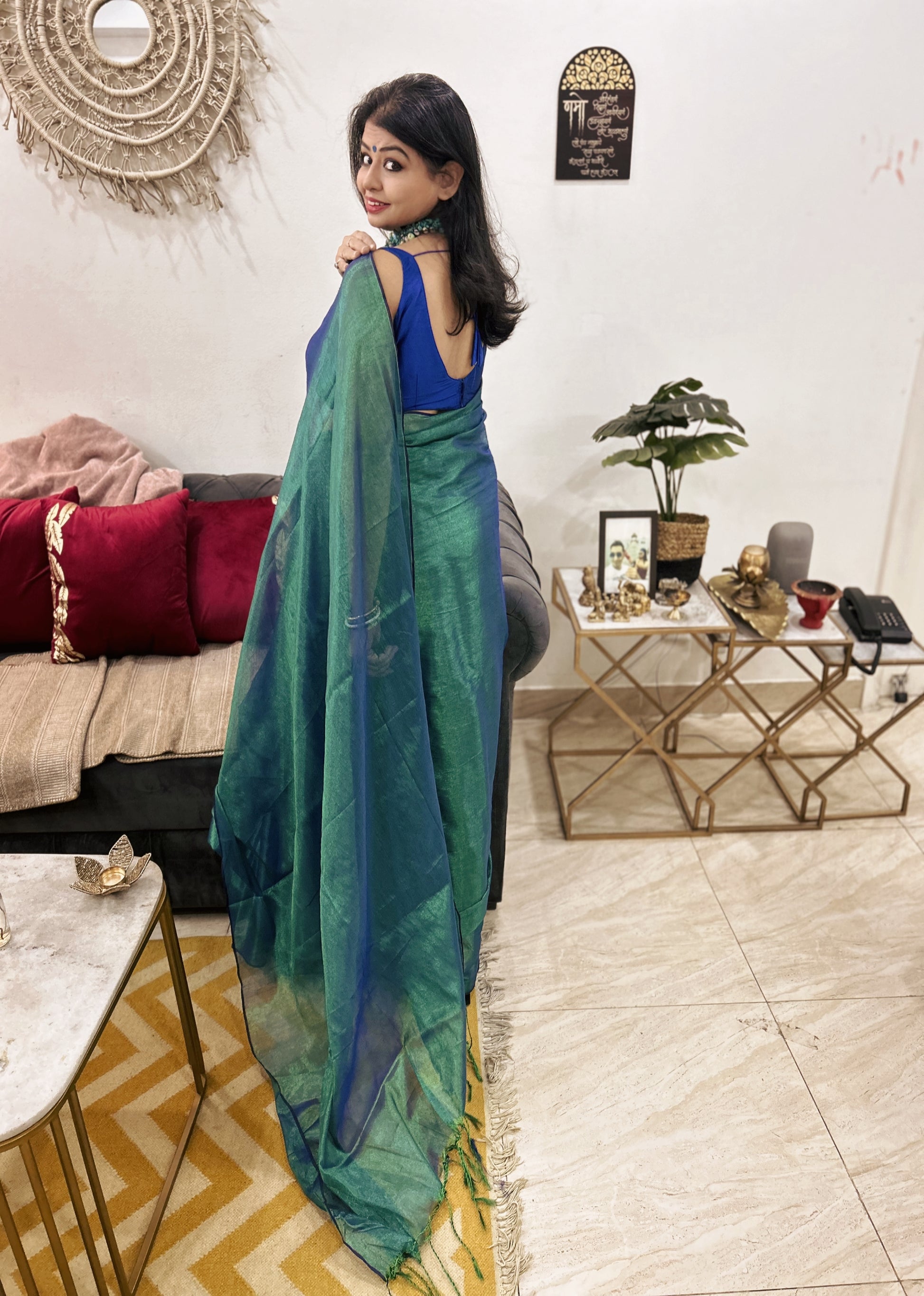 Embrace the ethereal beauty of Bengal craftsmanship with Neel Tara, our soft green and blue dual tone tissue saree. Handwoven by skilled artisans, this saree radiates a subtle shimmer that changes hues with every move, blending sophistication with tradition. The lightweight texture makes it ideal for festive gatherings, evening parties, or special celebrations. Comes with a running blouse piece.