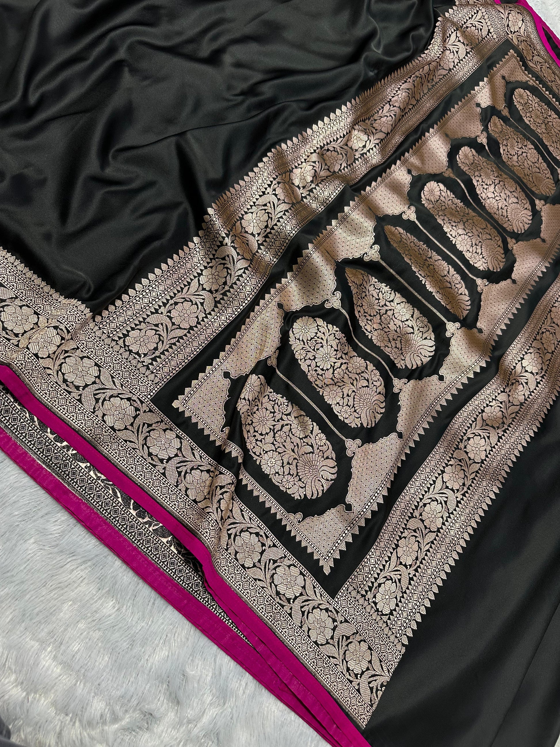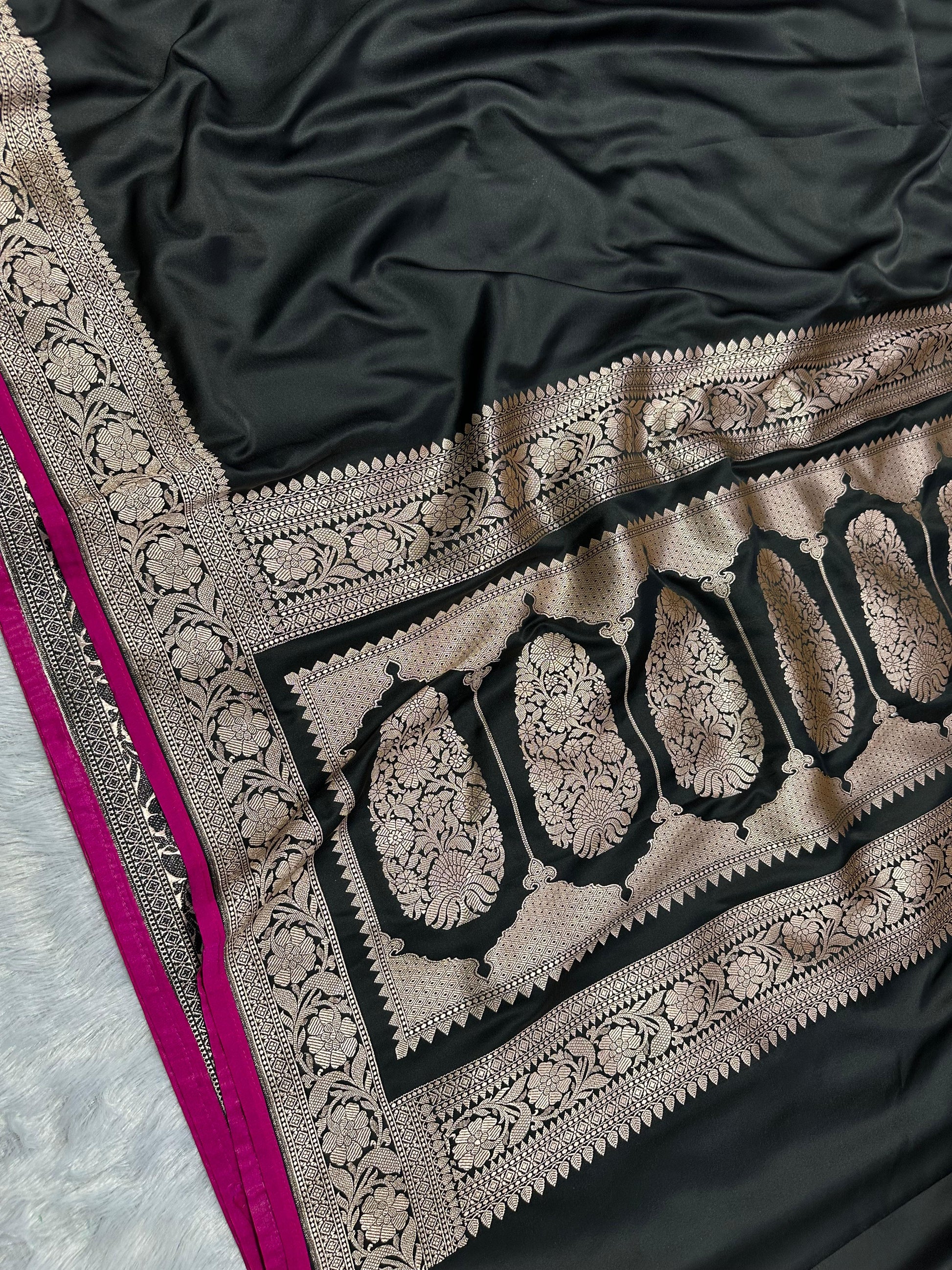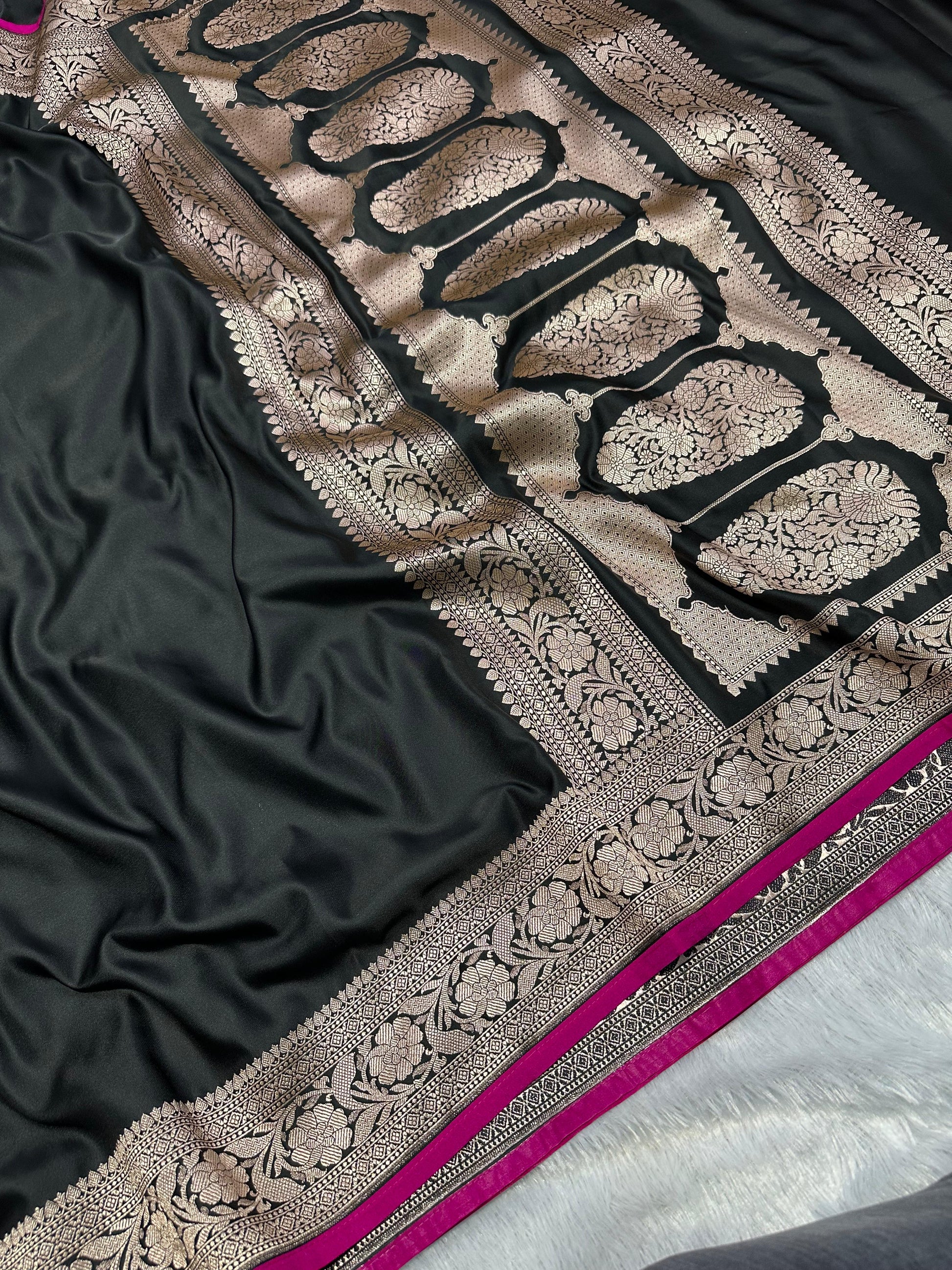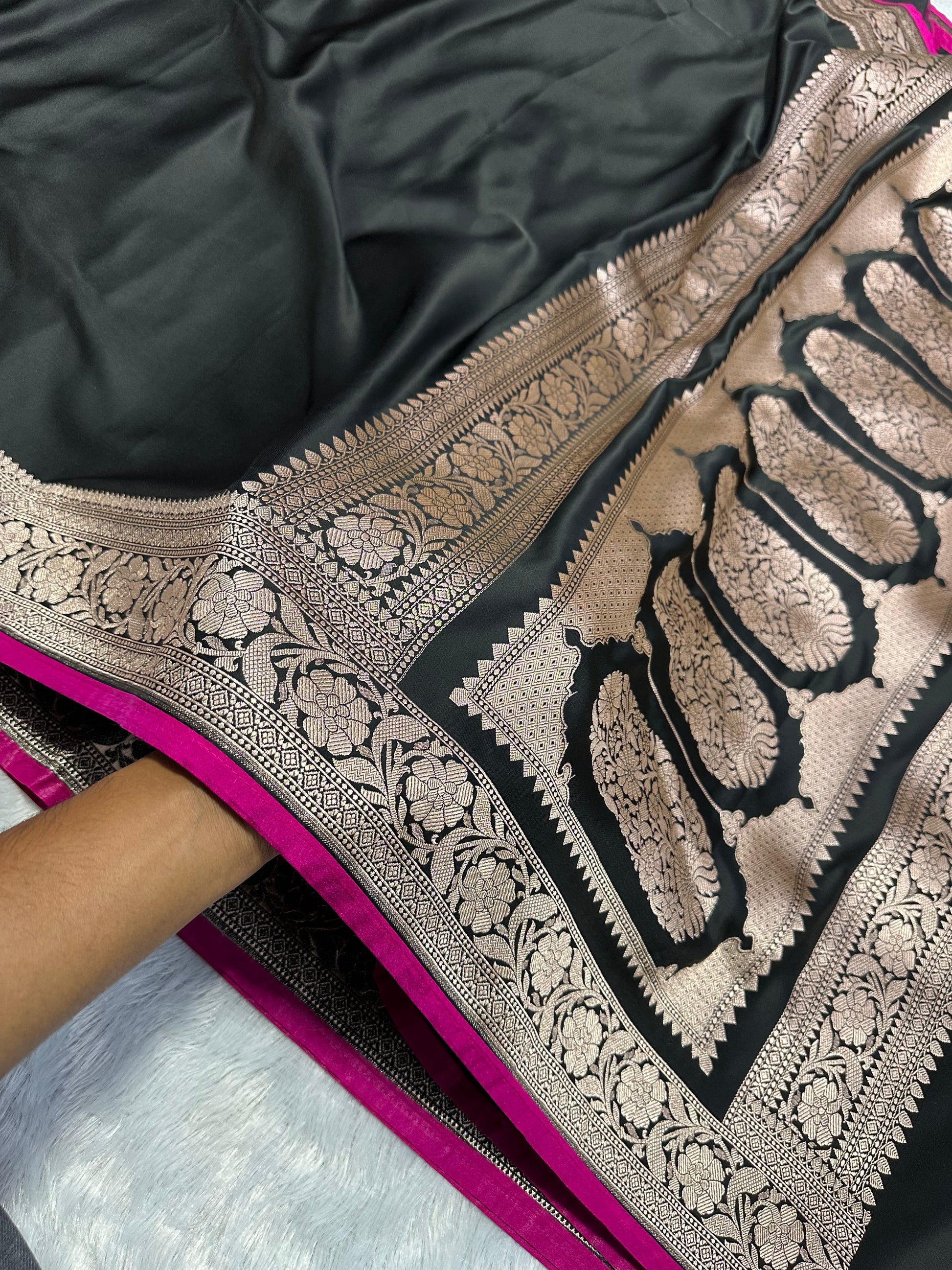 Unveil your inner royalty with SareeBari’s Noir Rani Elegance Pure Banarasi Katan Silk Saree, a masterpiece that embodies tradition, craftsmanship, and sophistication. The deep black body adorned with antique zari weaving creates a luxurious sheen, while the rani pink border adds a bold and vibrant contrast, making this saree a perfect choice for grand celebrations and festive occasions.