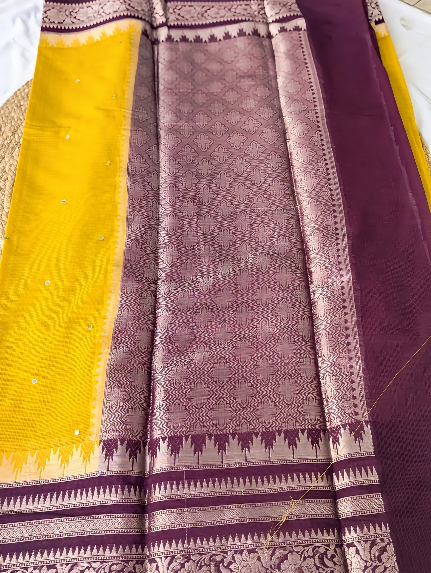 Embrace tradition with a modern twist with the Royal Radiance Resham Kota Silk Banarasi Saree. This luxurious saree features a rich mustard yellow base, adorned with intricate mirror weaving embroidery across the body, adding a touch of shimmer to its lightweight elegance. The striking maroonish wine border and palla offer a beautiful contrast, elevating the saree’s grandeur. Designed for festive occasions, weddings, and cultural events, the Royal Radiance Sareeis a perfect blend of comfort and elegance, making it easy to wear and style for any celebration.