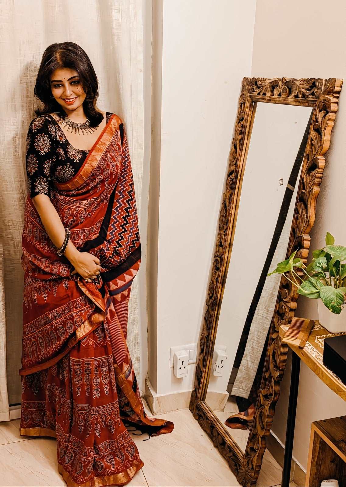 The deep scarlet color of this saree represents passion and beauty, making it a perfect choice for any special occasion. The intricate Ajrakh hand block motifs add a touch of traditional elegance and tell the story of skilled artisans passing down their craft through generations.