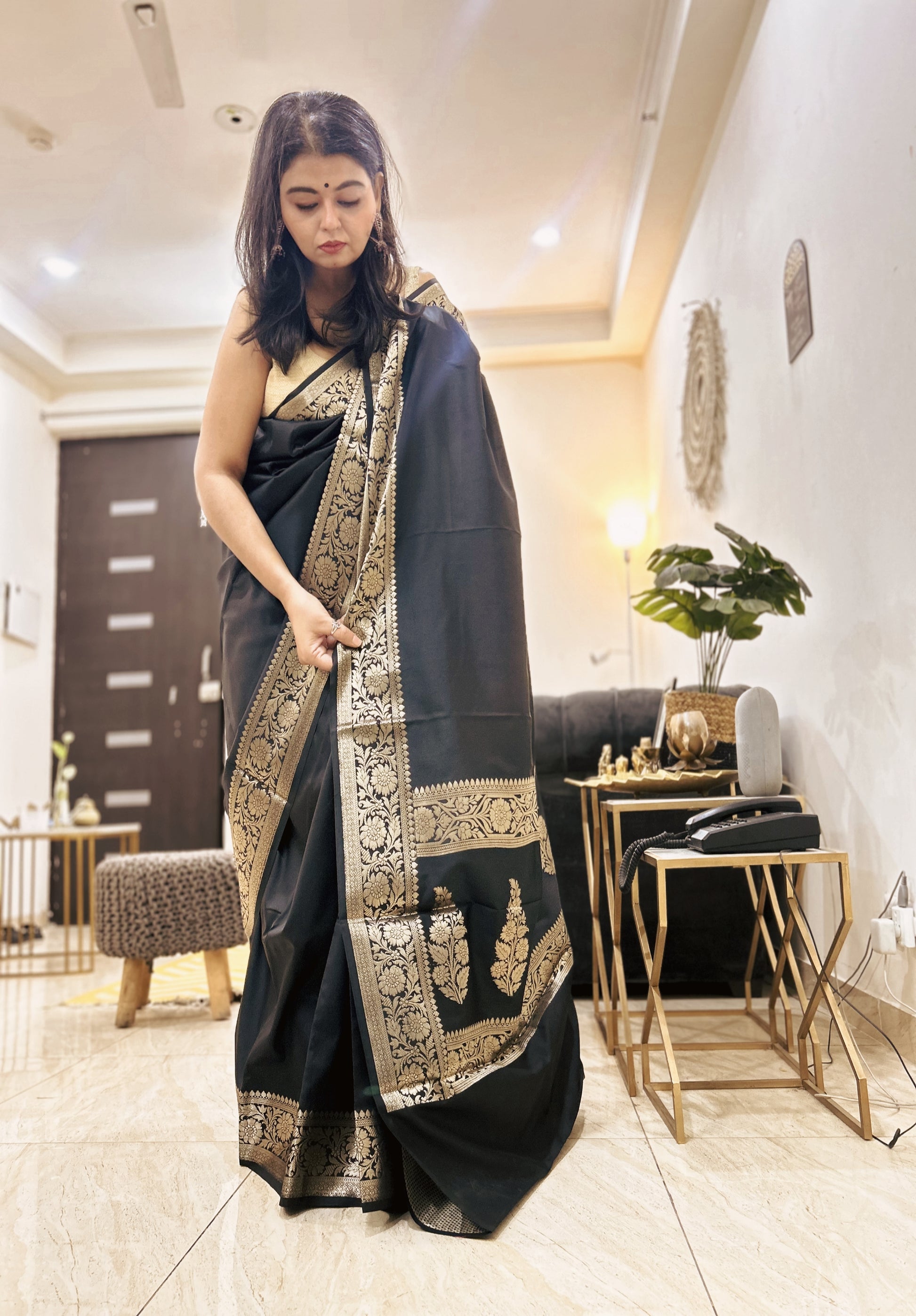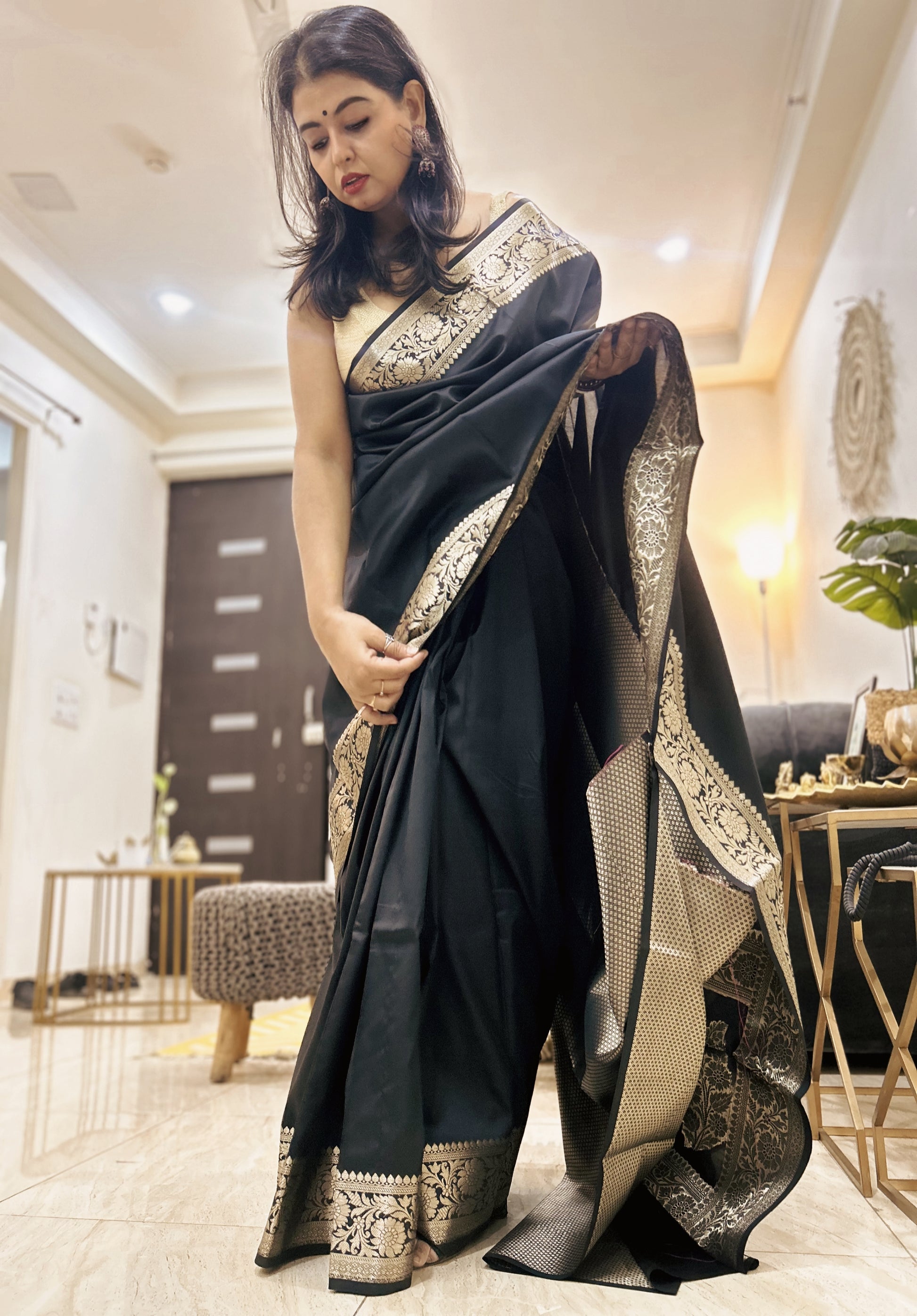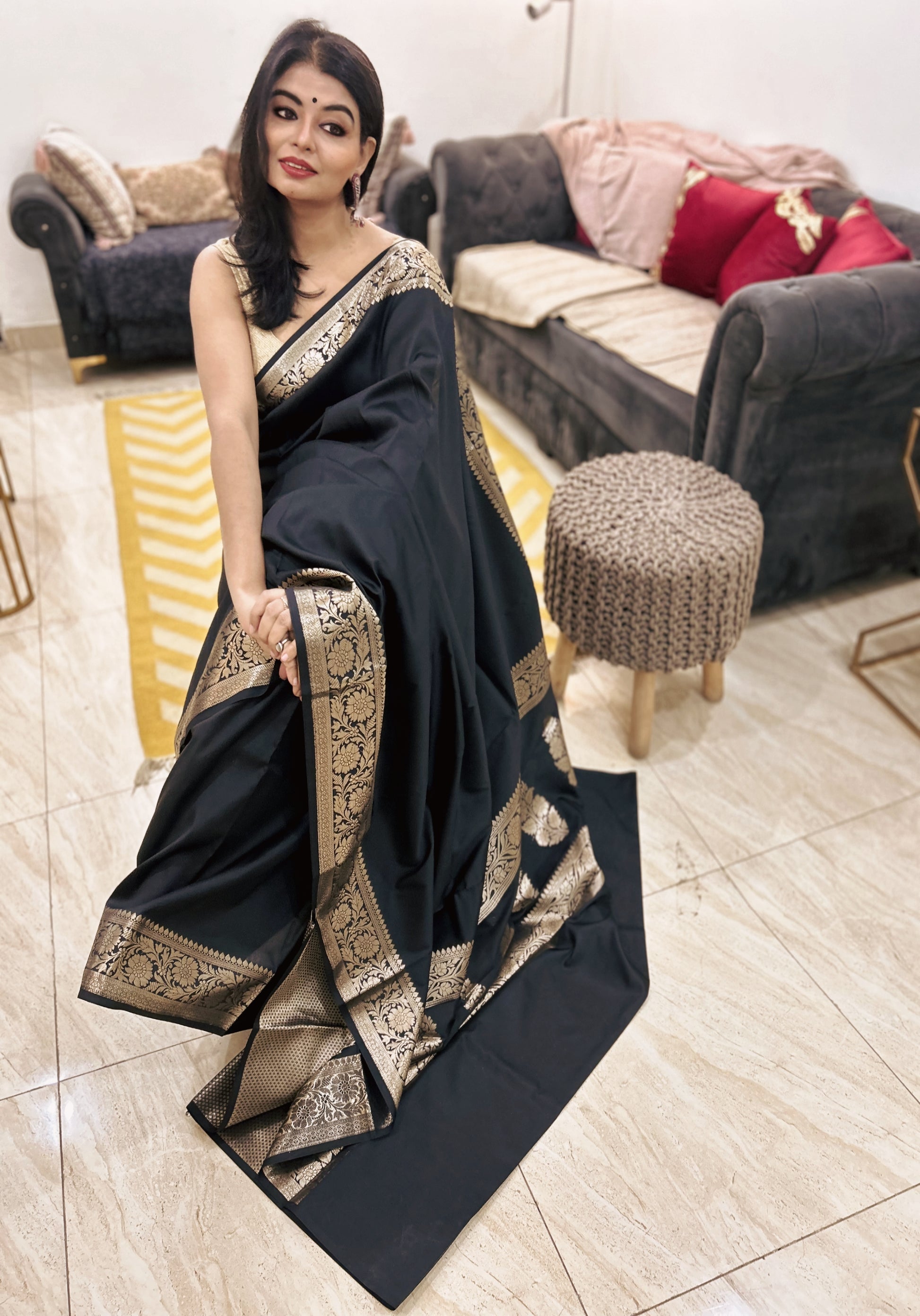 Add a touch of royal grace to your wardrobe with SareeBari’s Sunehri Noir Semi Katan Silk Saree, a perfect blend of tradition and sophistication. Handwoven in a classic black hue, this saree features intricate golden zari work across the border and pallu, reflecting the timeless artistry of Banarasi weaving.
