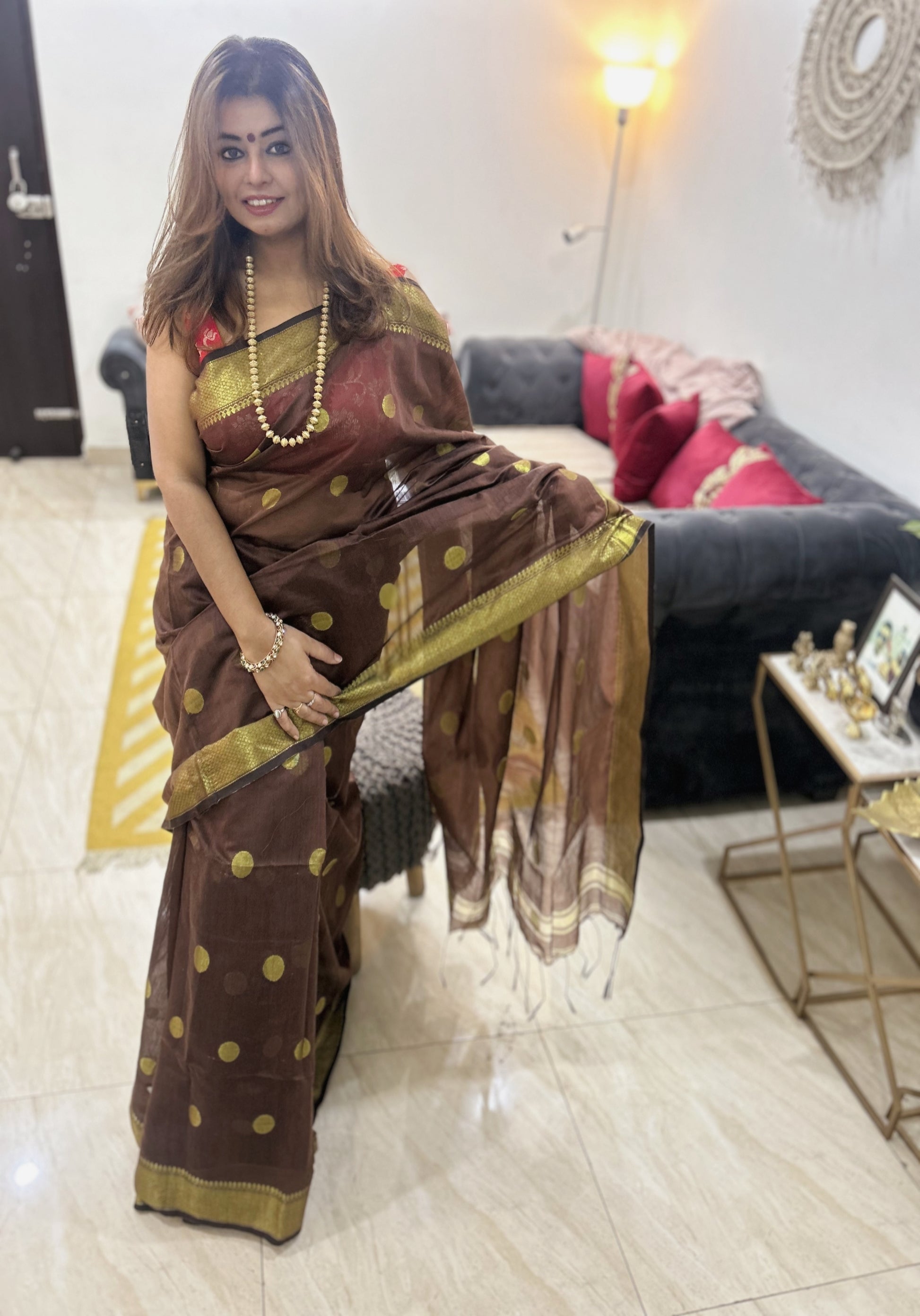 Bring home grace and tradition with the Suvarna Dots Bengal Handloom Cotton Silk Saree, a timeless piece woven with love and heritage. This exquisite saree features golden zari polka dots across a rich brown body and a shimmering zari border inspired by the elegant Maheshwari weaving style.